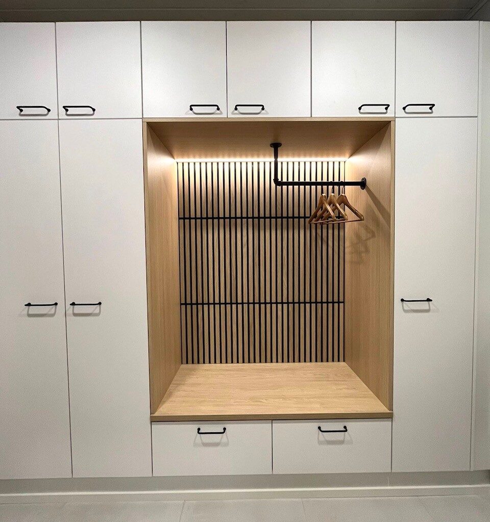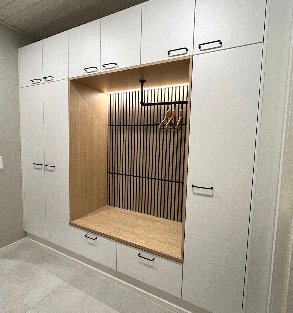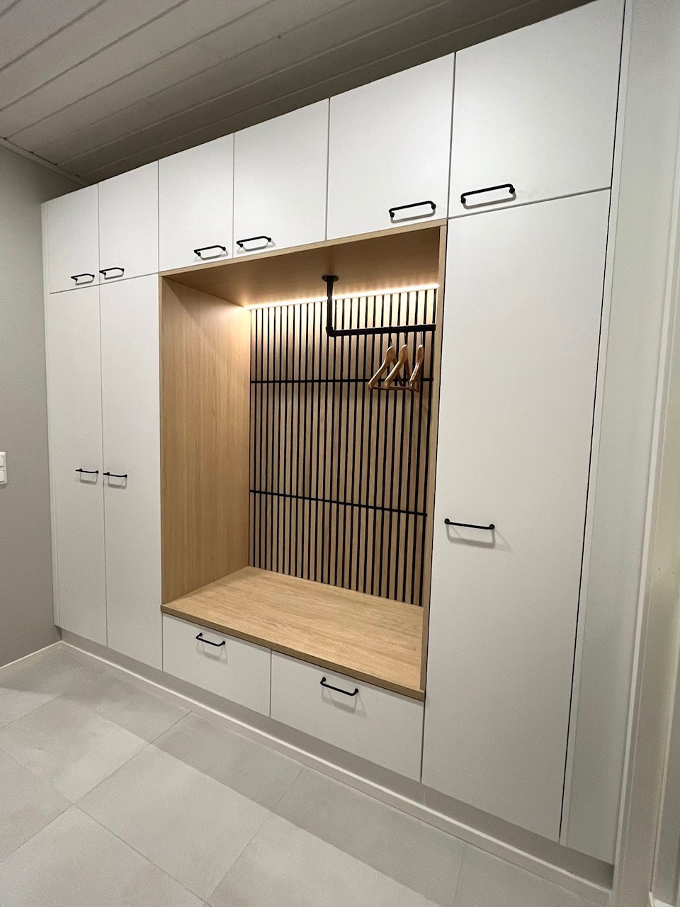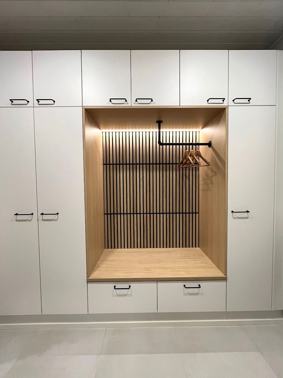 Uusissa komeroissa on reilusti hylly- sekä tankotilaa. Komeroiden jatkeena on myös penkki, joka tuo lisää säilytystilaa sekä mukavuutta. Penkin takana upeat Hotán® Rimapaneelit….