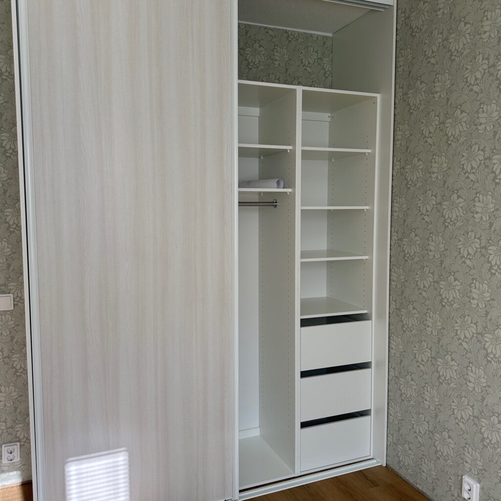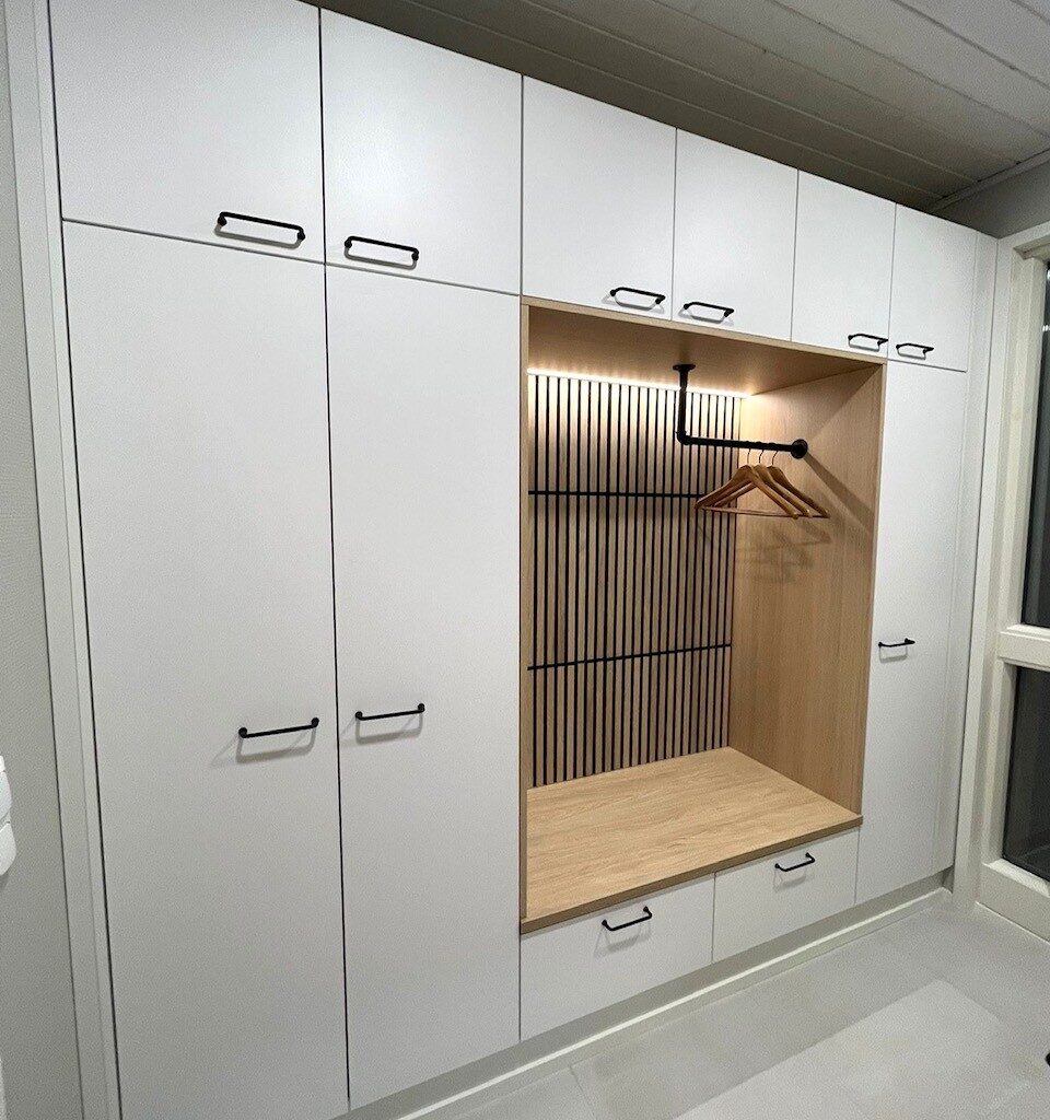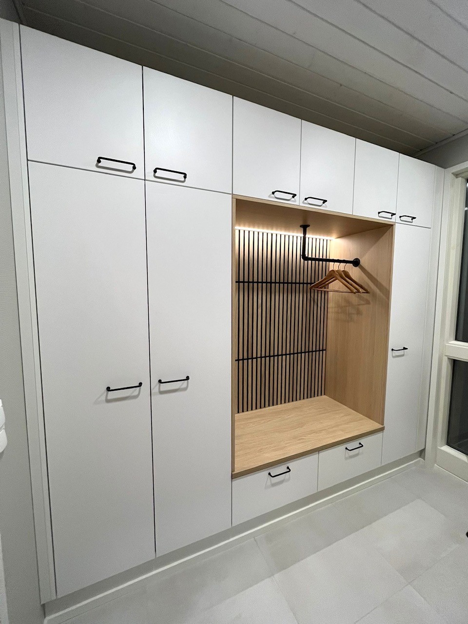 Tähän kohteeseen toteutettiin valkoiset eteiskalusteet tammen värisillä yksityiskohdilla. Komeroiden sisällä on niin laatikoita, hyllyjä, kuin vaatetankoakin. Säilytystilaa siis riittää. Rimalevyt ja musta vaatetanko on asiakkaan itse hankkimia….
