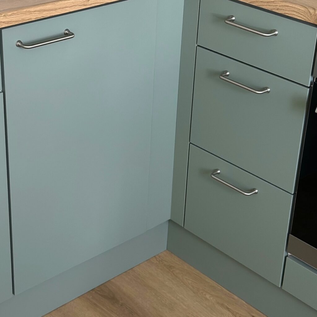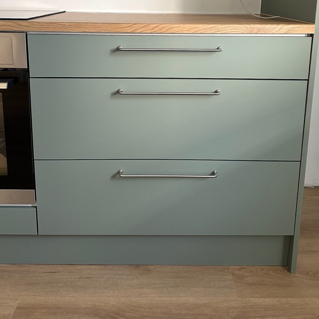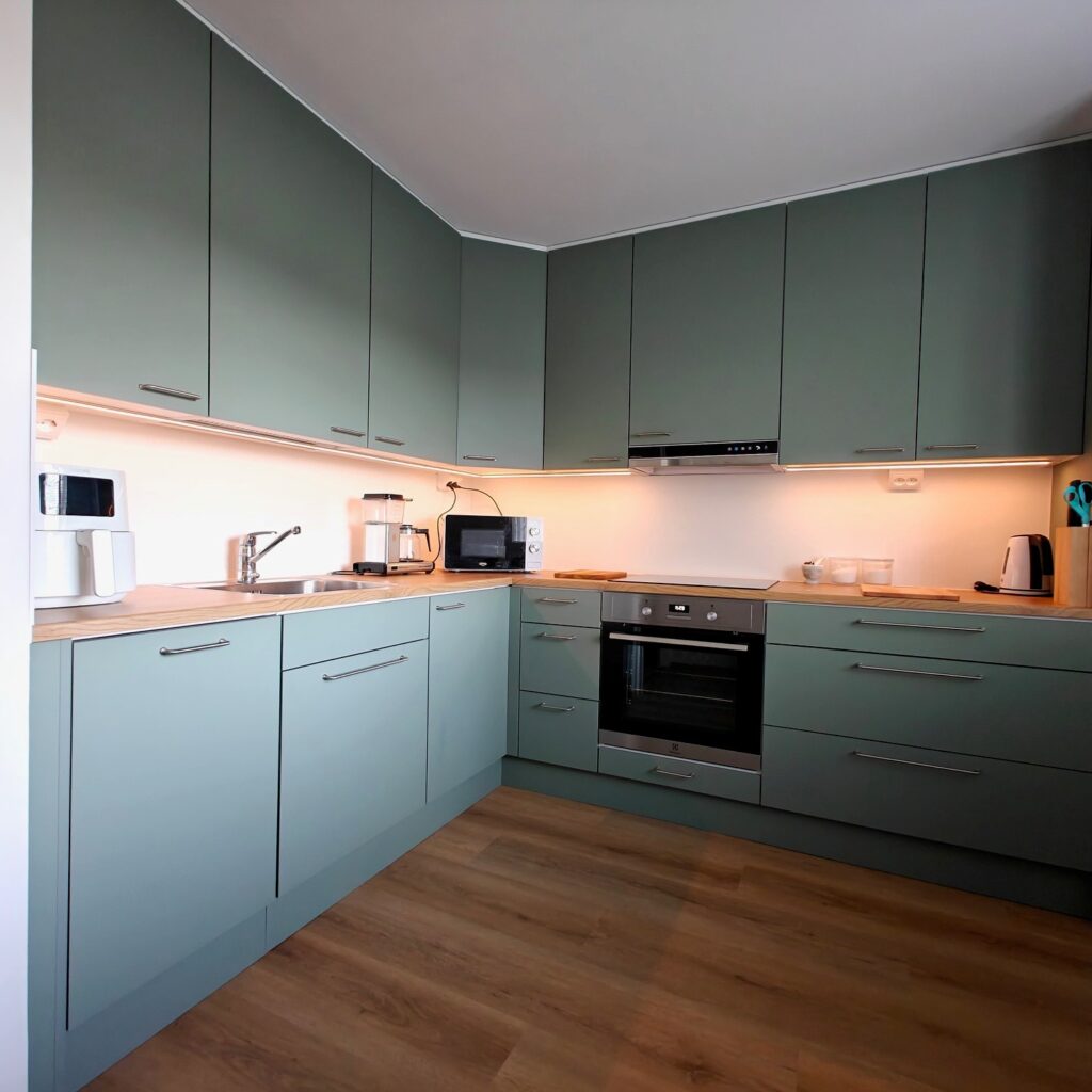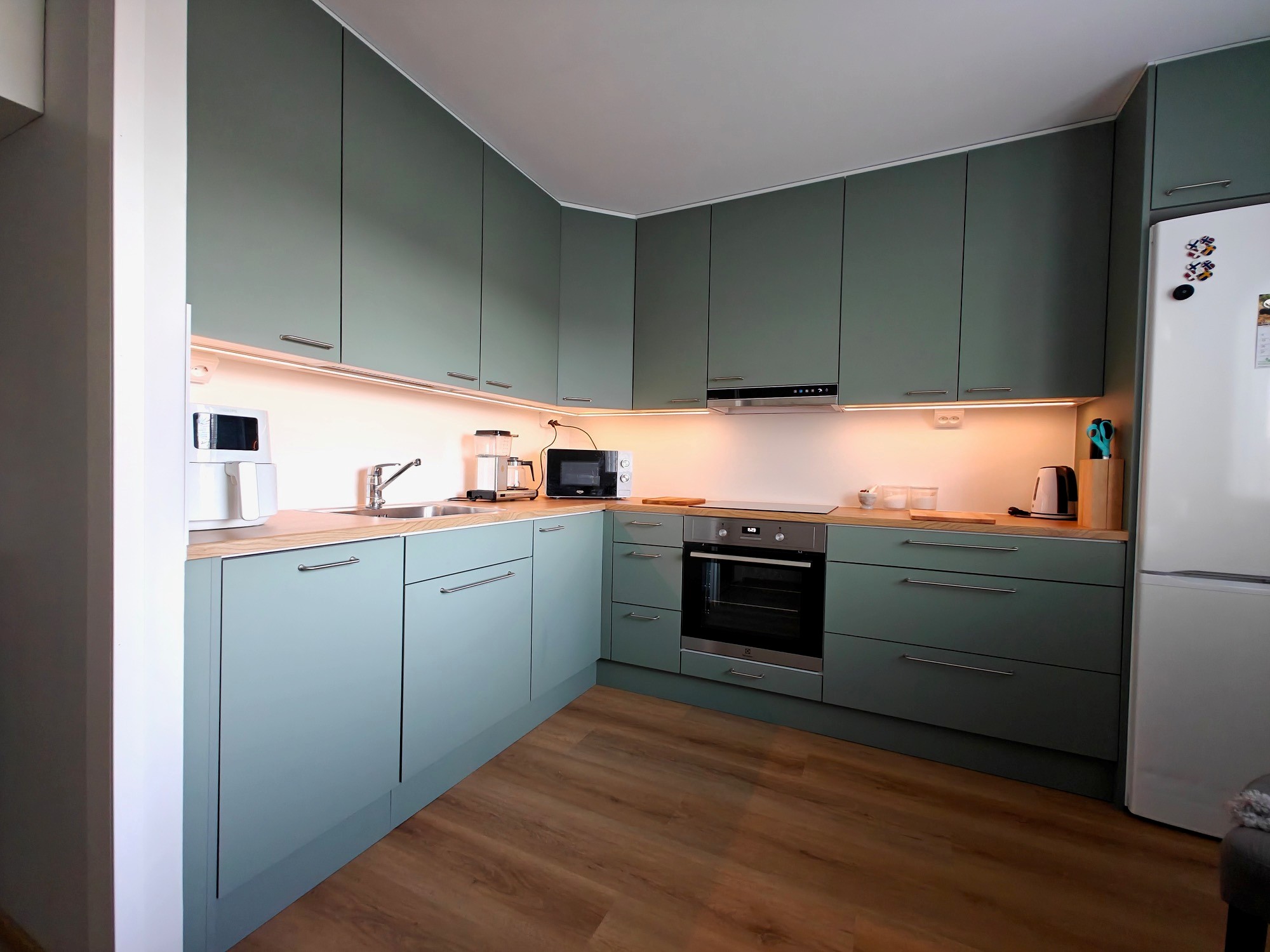 Jälleen kerran yksi upea muutos kerrostalokeittiöön. Alakaappeihin laitettiin profiilivetimet ja yläkaapit on ilman vetimiä. Mikrokaapissa sekä maustekaapissa on pomppusalpa helpottamassa oven avaamista….